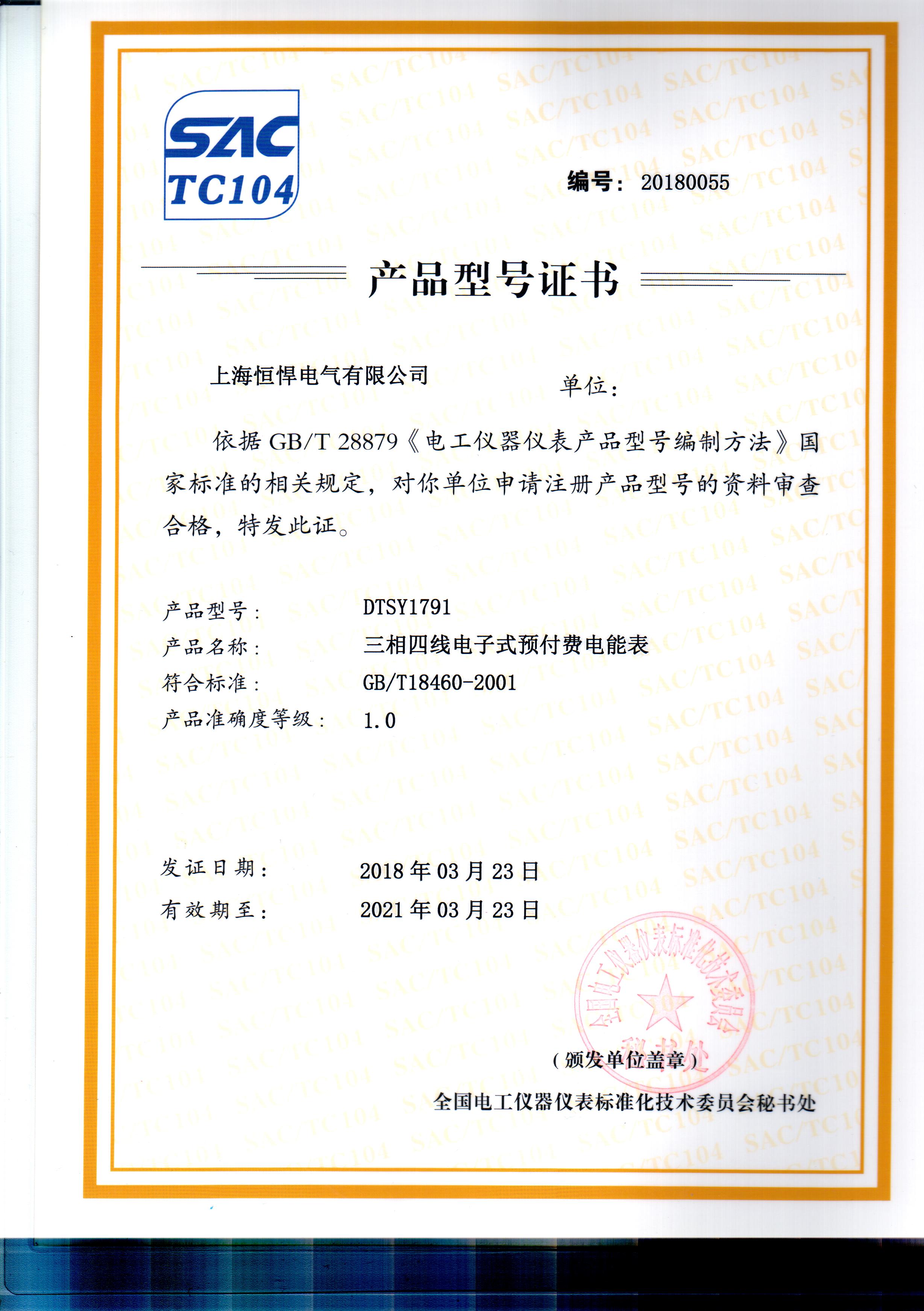 恒悍三相預付費電表型號證...